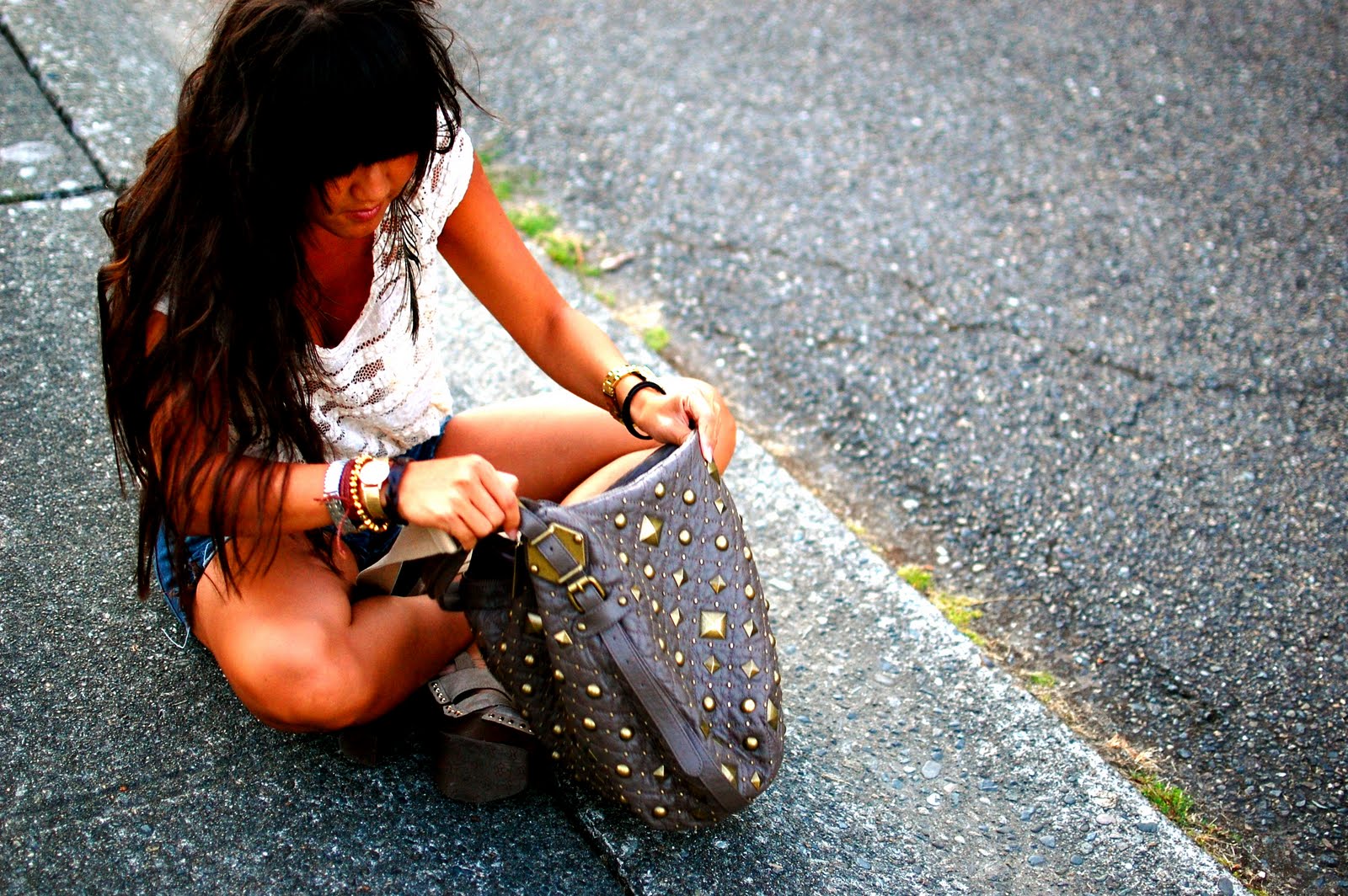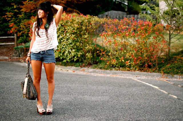 Random boutique top, Seven for All Mankind cutoff shorts, BCBG suede platforms, DKNY studded handbag, Peacock feather earrings found in my ETSY store, Michael Kors/Vintage watches, Mexican beach vendor bracelet**