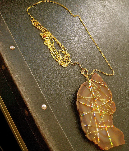 Giant agate slice (discovered under a pile of dirt in the backyard) wrapped with 24 gauge gold wire and bright multi-colored seed beads. Vintage books: products of recent thifting.